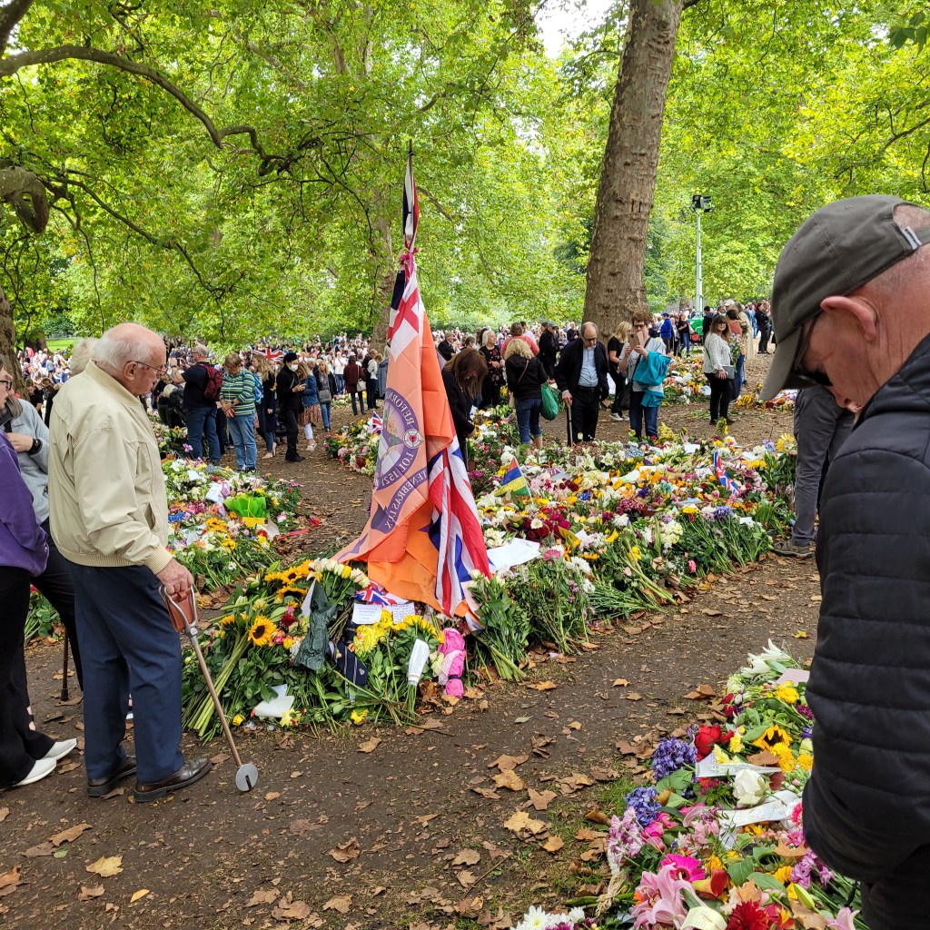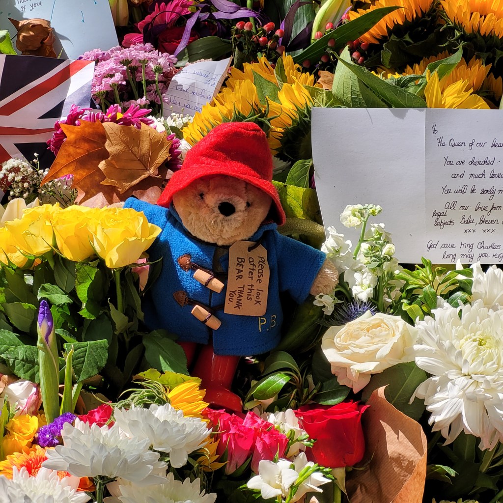 Almost immediately, the floral tributes began to arrive at Balmoral, Windsor Palace, just outside London, and at Buckingham Palace. The first bouquets arrived at Balmoral before the Queen’s younger children and grandchildren did. Only King Charles and Princess Anne, the Princess Royal were with the Queen when she died. By the second day after the Queen’s death, the decision was made to move the flowers from Buckingham Palace at the end of each day to Green Park, a huge park adjacent to Buckingham Palace and St. James’ Palace. The sheer number of bouquets, Paddington bears, notes, cards, children’s drawings, flags from organizations she was a patron for, were staggering, yet touching and beautiful.