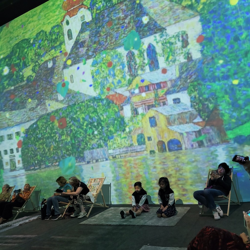 In the next part of the experience, we moved into a dark room where Klimt’s works were deconstructed and then slowly reconstructed on the walls of the room as each work moved around the four exterior walls and the walls of an interior cube in the center. Plenty of seating was around the exterior. Classical music played in the background. Beethoven’s 5th stays memorably with me, as a child of Huntley and Brinkley’s newscasts in the US.