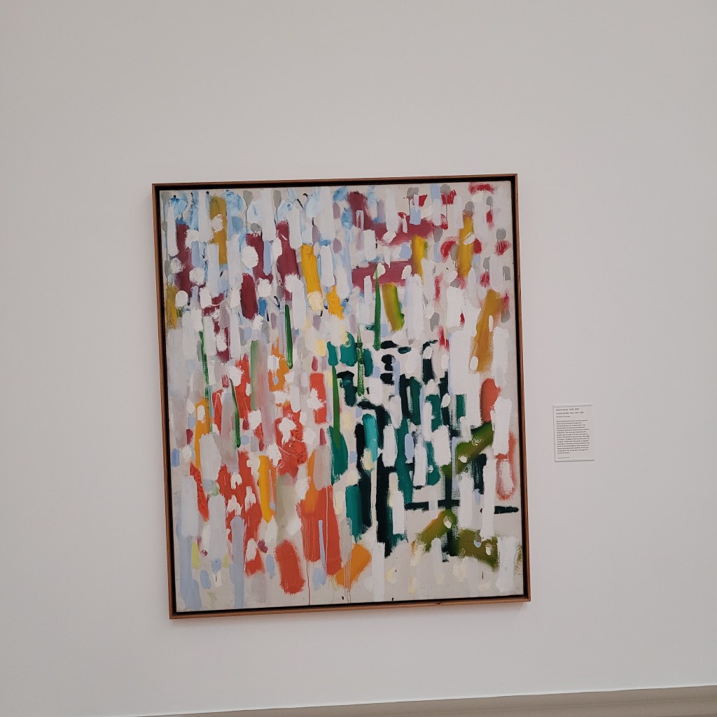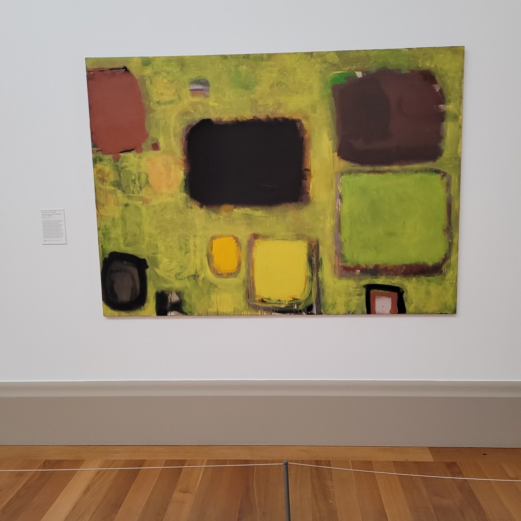 There was much more to see, of course. Here are two more colorful pieces that I really enjoyed seeing during my visit. The first piece below is by Jeremy Moon who used the grid to explore the relationship between flat surfaces and three-dimensional ones. The second one is By Howard Hodgkins and is also one where lines and dimensions are important, but a figure appears, as well. I am also drawn to the colors.