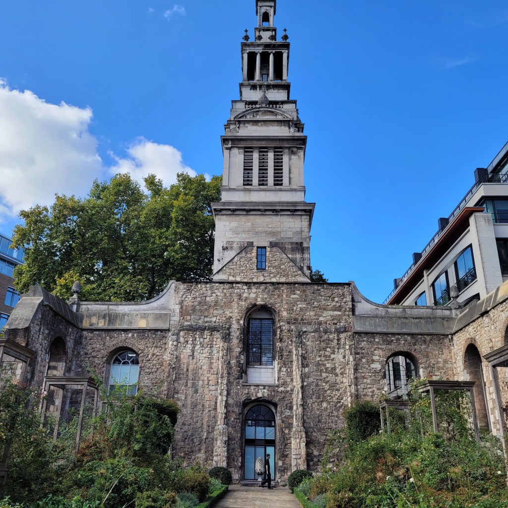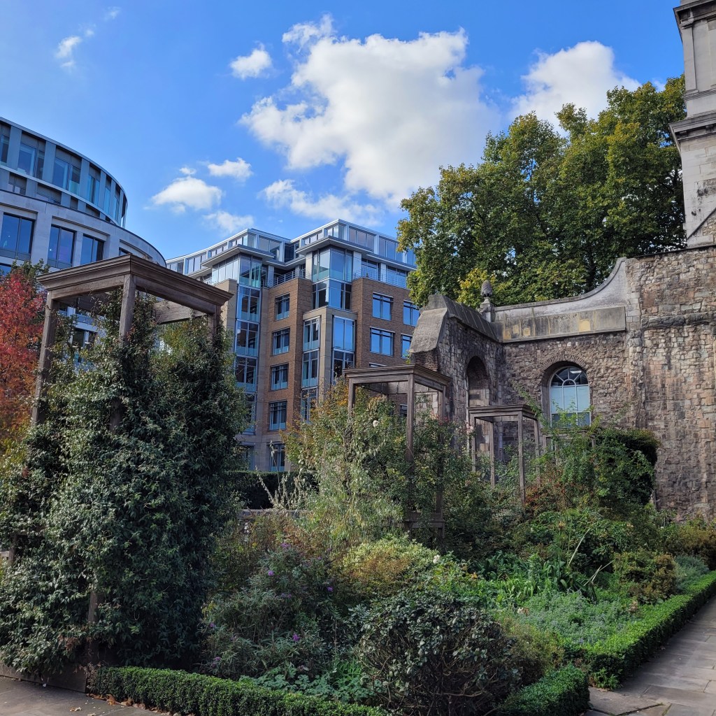 As I neared the Tube Station for my return to Bloomsbury, I noticed a lovely garden built in the midst of the ruins of a church of some kind, I thought. After taking a few pictures, I found a plaque identifying the place as remaining parts of the Christophen Wren designed Christ Church built to replace the Greyfriars Church, left after the dissolution of the monasteries. The Greyfriars church was destroyed in the Great Fire of London. Christ Church was one of 14 Wren churches destroyed by Nazi bombing during WWII. The garden funded by a private company is a peaceful haven in the busy center of the city.