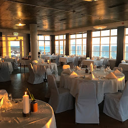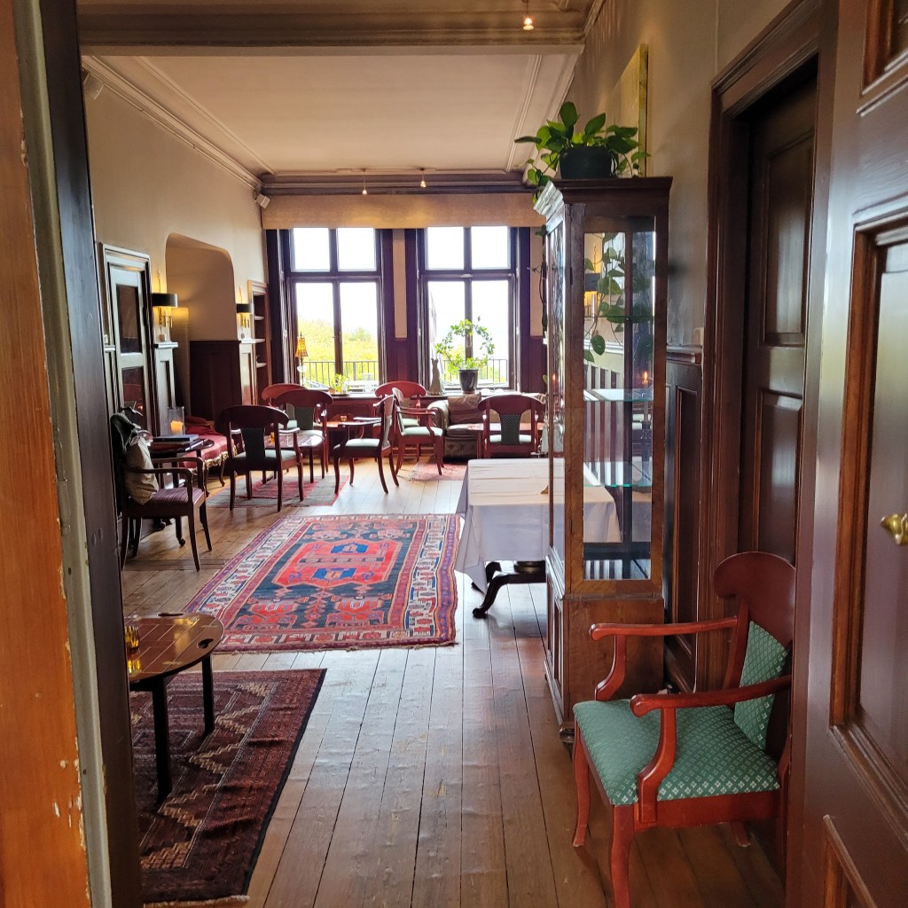 The entrance to the hotel was up a set of steps to a set of doors that looked as if the hotel might have been closed for the season. Bu to our great luck they were open, I used the middle stock photo to show the area of the dining room where were seated and my own rather poor shot out the window at our lunch