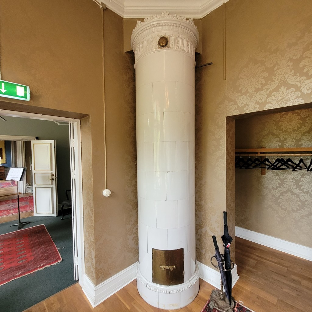 We were able to peek inside the entrance and get a view of a few of the rooms with some of the original furnishings, including the large Swedish heater in one corner.