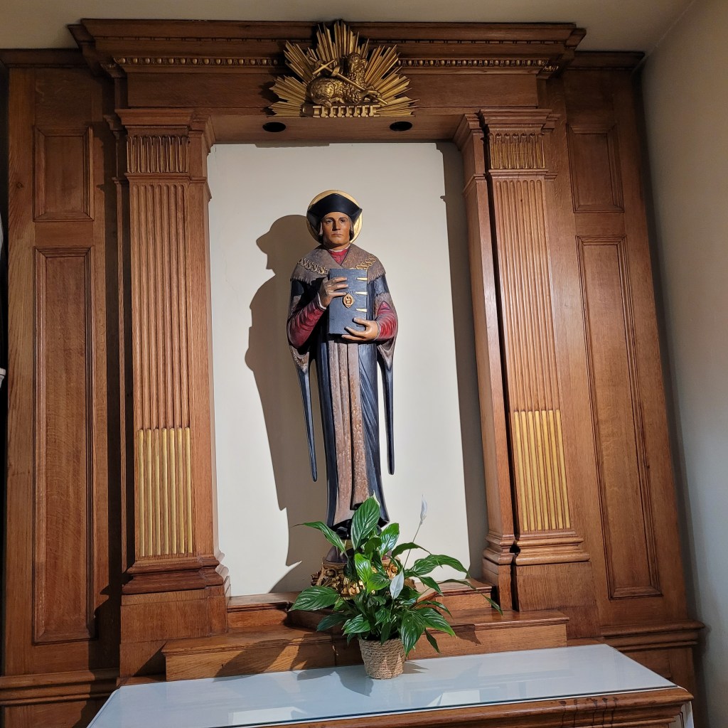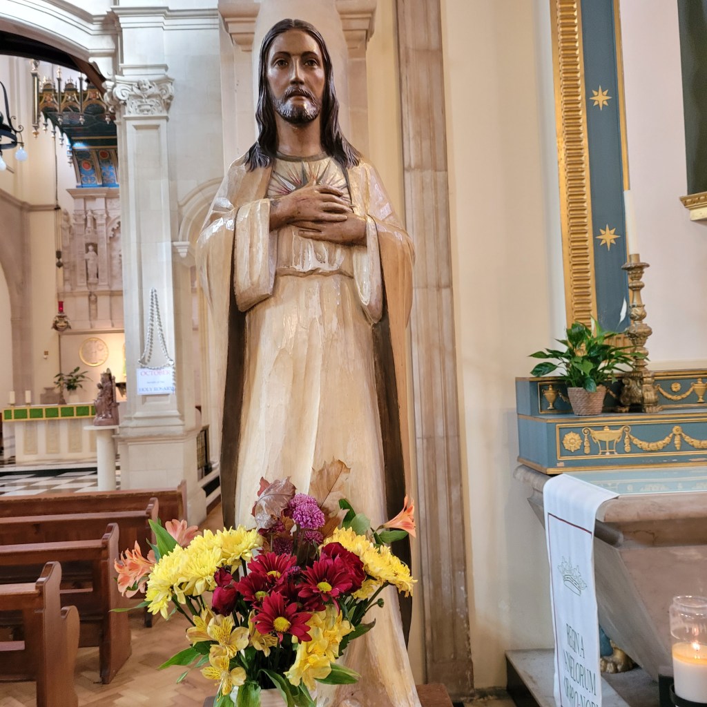 building dates back to 1909. It replaced the chapel of the Royal Sardinian Embassy that had gradually become a parish church for the area. The old chapel had a long history that included destruction centuries ago during anti-Catholic riots and bombing by the Nazis during World War II. The current church is said to keep aspects of the old chapel and, indeed, the coat of arms of the House of Savoy (Sardinia and Italy’s former Royal family). When I first entered the church, it seemed like, maybe it was a bit plain. But then I took a better look. And these photos show some of the simple beauty I saw within and the peace I felt from the several people I saw kneeling in prayer throughout the church. The first row shows traditional statuary of saints not found as often in more recently built Catholic churches, but very popular in churches in Italian parishes throughout Europe and America. See my pictures of the Italian Church in Clerkinwell that I visited the morning that Queen Elizabeth died. In the first picture, it would appear that the feet on the Statue of Saint Peter, the first Pope, have been rubbed to a shine by years of passing pilgrims and worshipers. No, folks, I have no idea why. I believe that is Saint Christopher next to the side Altar in the second picture, and that is a statue of