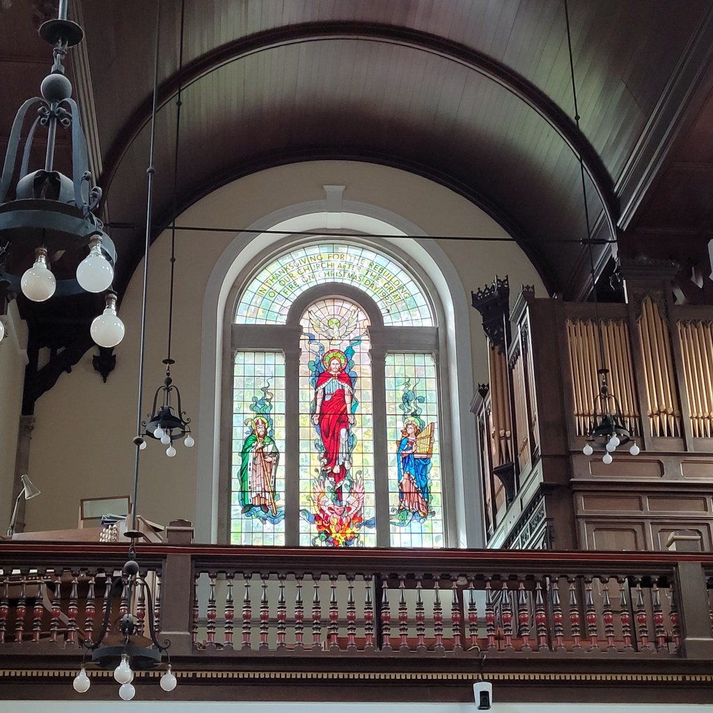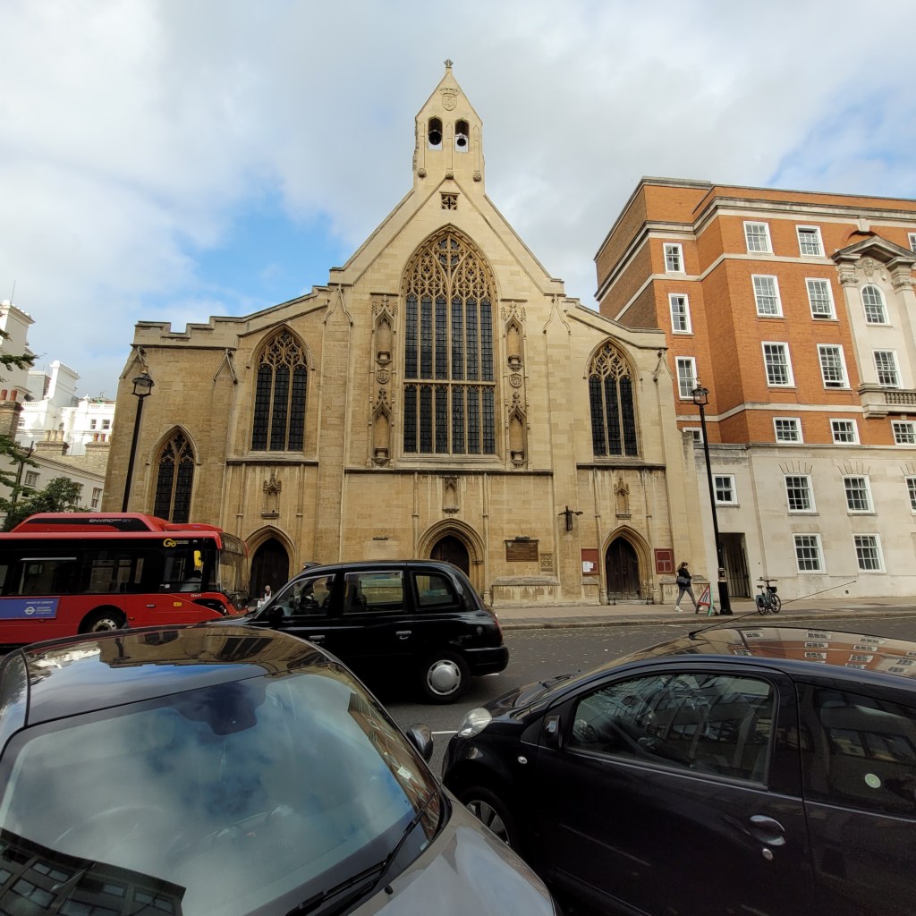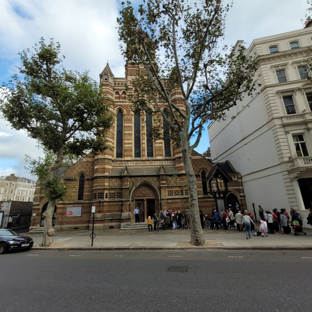 I had two more churches in South Kensington on my list that I hoped to visit before returning to home base. The First was Saint Augustine’s. When I arrived there, I saw a crowd of people lined up outside. I noticed that the front glass door appeared to be open, so I went in. The worship space had tables set up with tablecloths where the pews would be. A gentleman told me that they were preparing for a community event, I snapped a quick photo and left. The church looks lovely, it is on the list for next year.