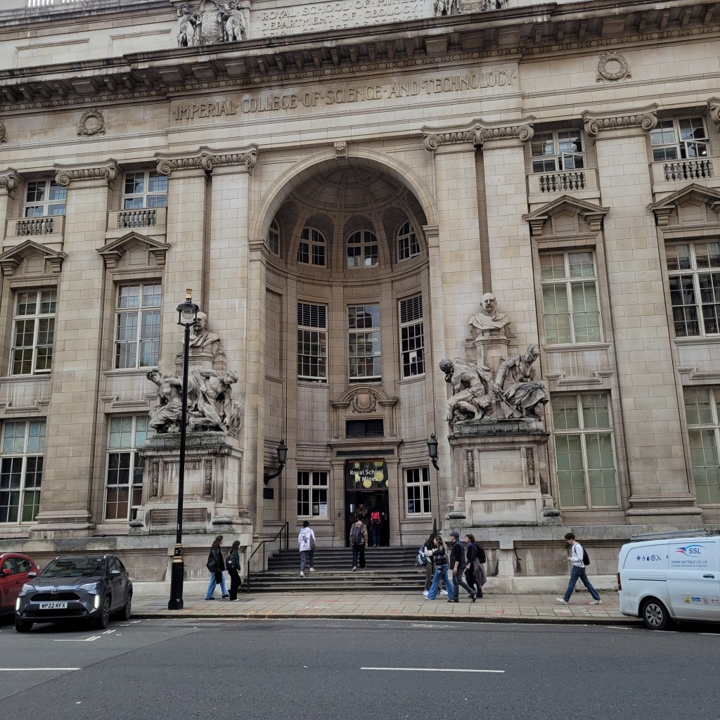 So, second interesting church closed, I started walking back toward the Tube station and realized I was near the Royal School of Music and the back side of the Royal Albert Hall. I took a quick picture of each of them and then noticed the Imperial College of Technology and Science Building with the entrance of the Royal School of Mines on the side I was passing. Having worked with many great scientists and engineers (including mining engineers) I had to take a picture of this fine building too.