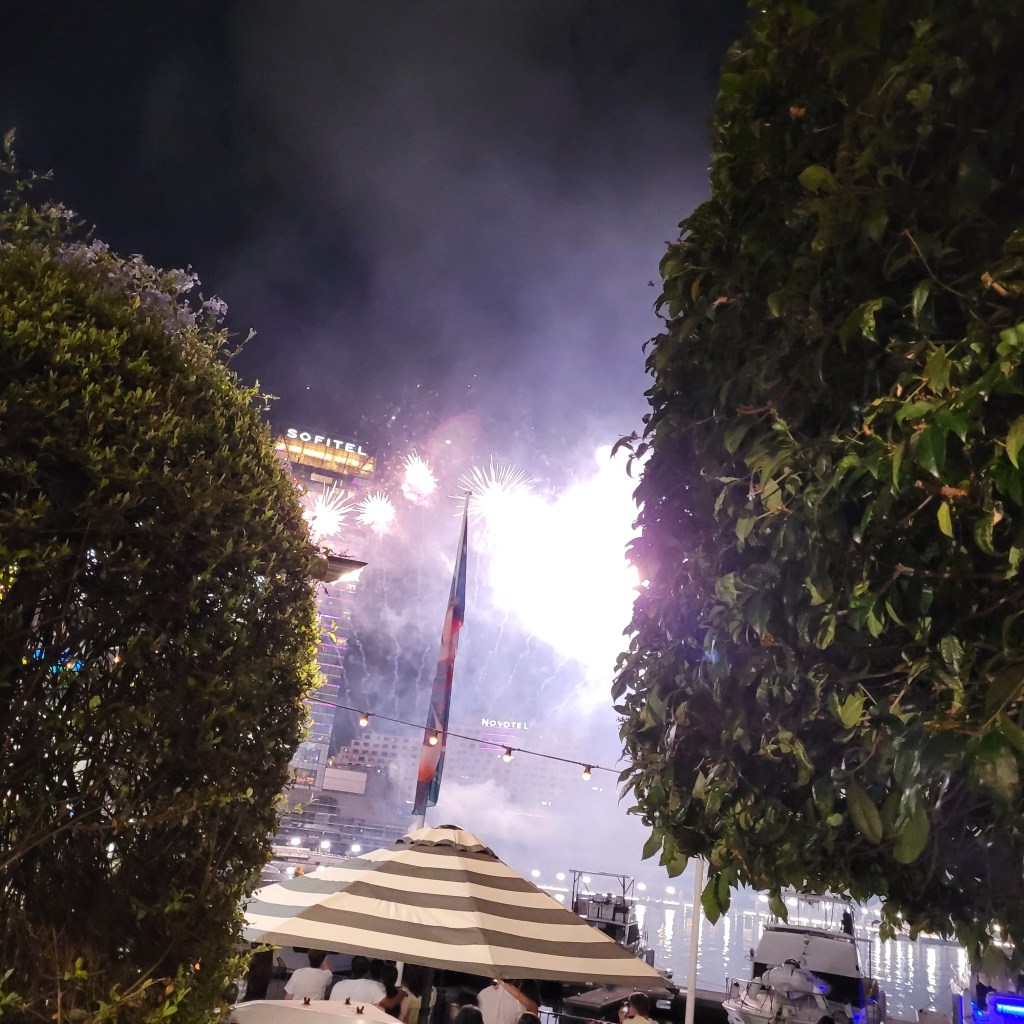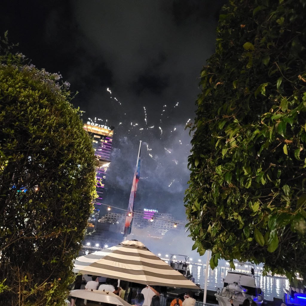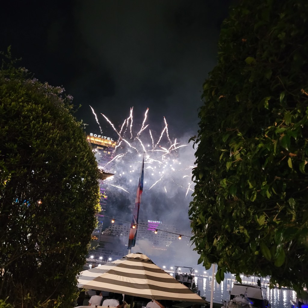 That evening, we went to dinner at Darling Harbor. Steve had learned of a series of fireworks displays and water shows in commemoration of Lunar New Year. We hoped to finish dinner and try to find a spot to see the fireworks over the water. We found a spot at one of the many restaurants that line the harbor, but because of the crowds present, were unable to get seated, served, and complete our meals before the fireworks started. I was able to find a spot between two bushes to get some shots of the fireworks-not great quality, but I hope it gives you an idea of the spectacular,