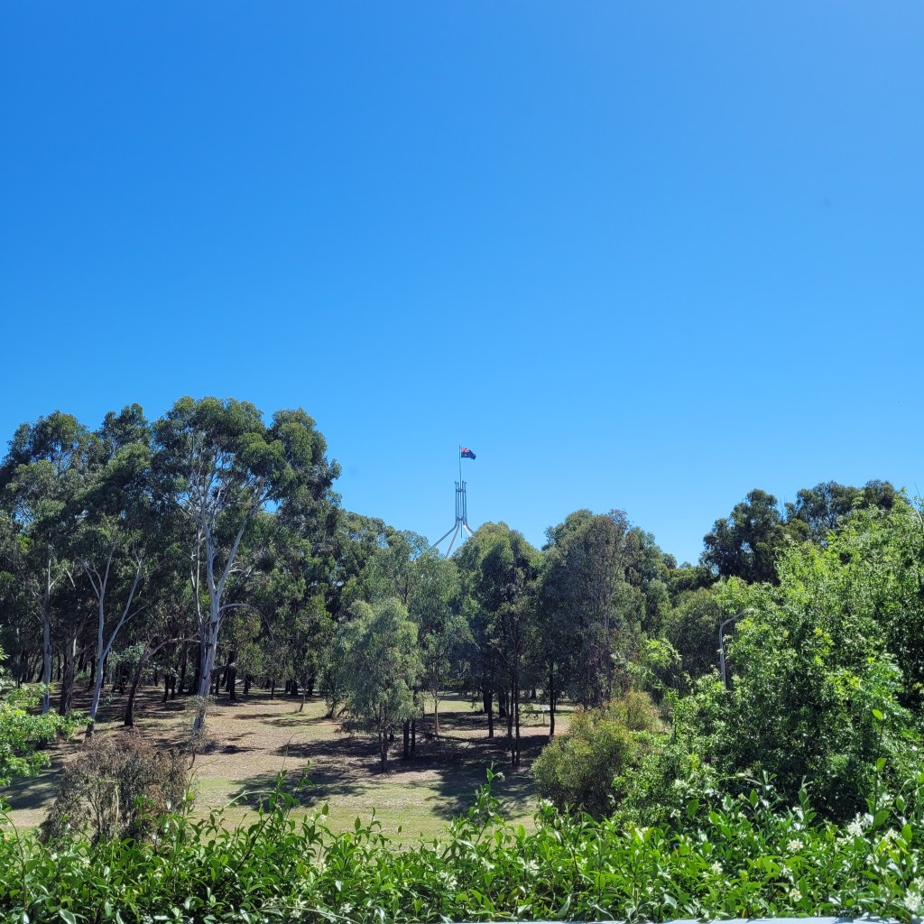 Our journey ended in the late afternoon and a cab rid took us to a rather lovely condominium apartment within walking distance of Australia’s Parliament building. Below is a picture of the spire of the building taken from our living room.