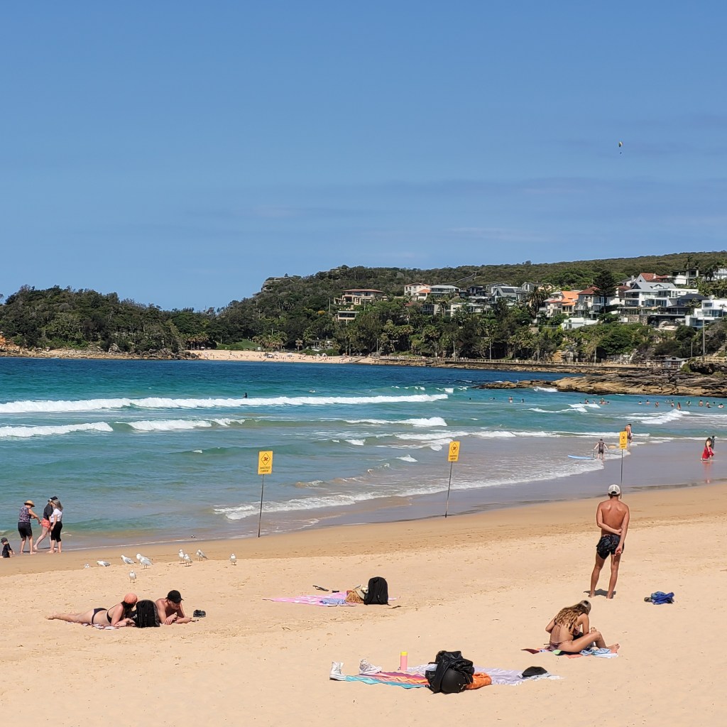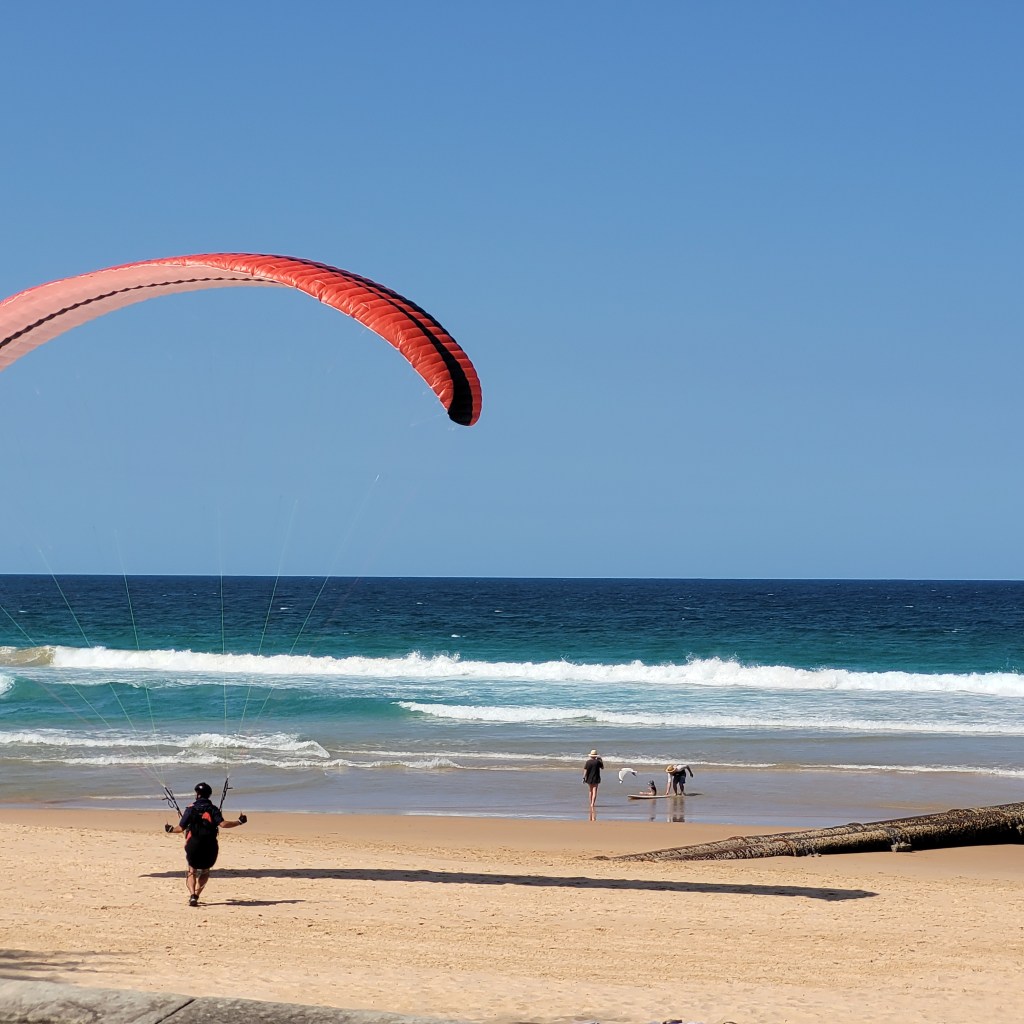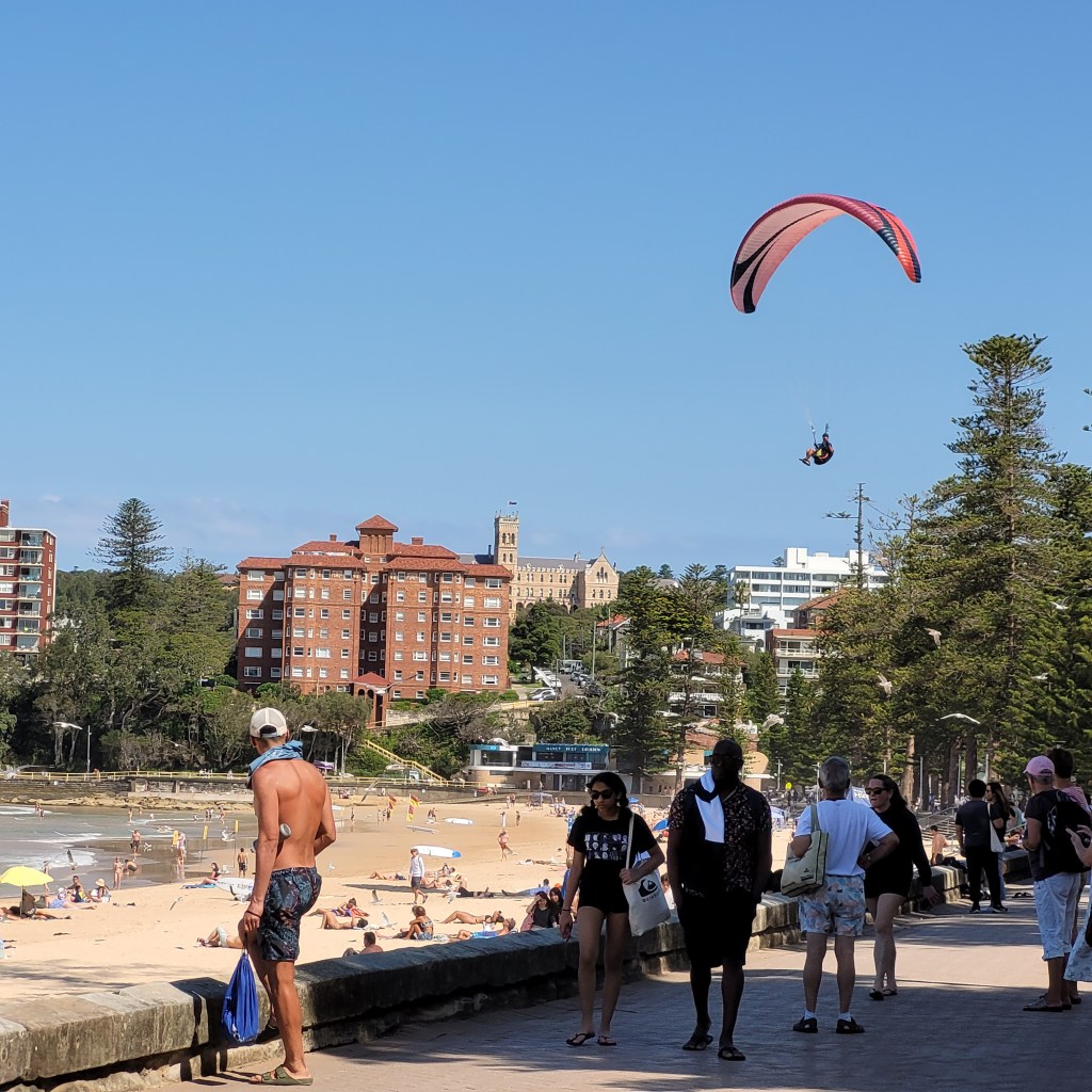 After a brief ferry ride, we arrived at Manley for an afternoon at the beach. Manley is a beach town that has a small town feel to it. The beachfront has a promenade with plenty of space for walkers and bikers, a wide swathe of sand and some great waves hitting the shore. On the day we were there, there were some people hang gliding and landing on the beach!