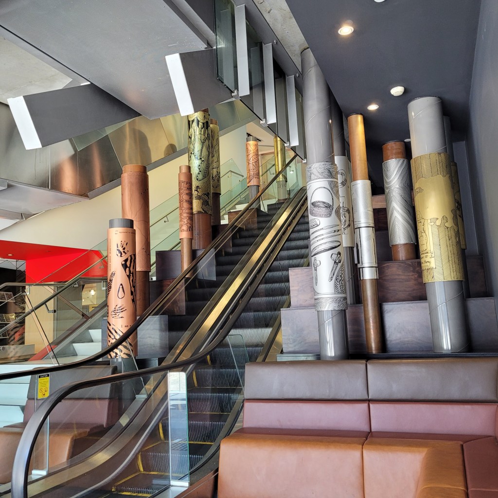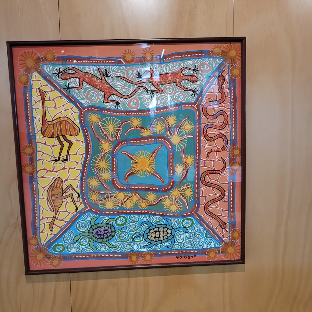 As I prepared to begin blogging today, I realized I had a small group of pictures from our visit to the Koorie Heritage Centre, another interesting building in a great new civic space called Federation Square, near the venerable railway station and close to the Yarra River which Steve and I have enjoyed during our Melbourne days. The Koorie Centre has space for temporary exhibitions of work by local indigenous artists as well as a place for indigenous elders and experts on traditional crafts. We were a bit disappointed that we had missed the most recent exhibition, but Steve and I both like the gift shop. Steve liked it a lot!