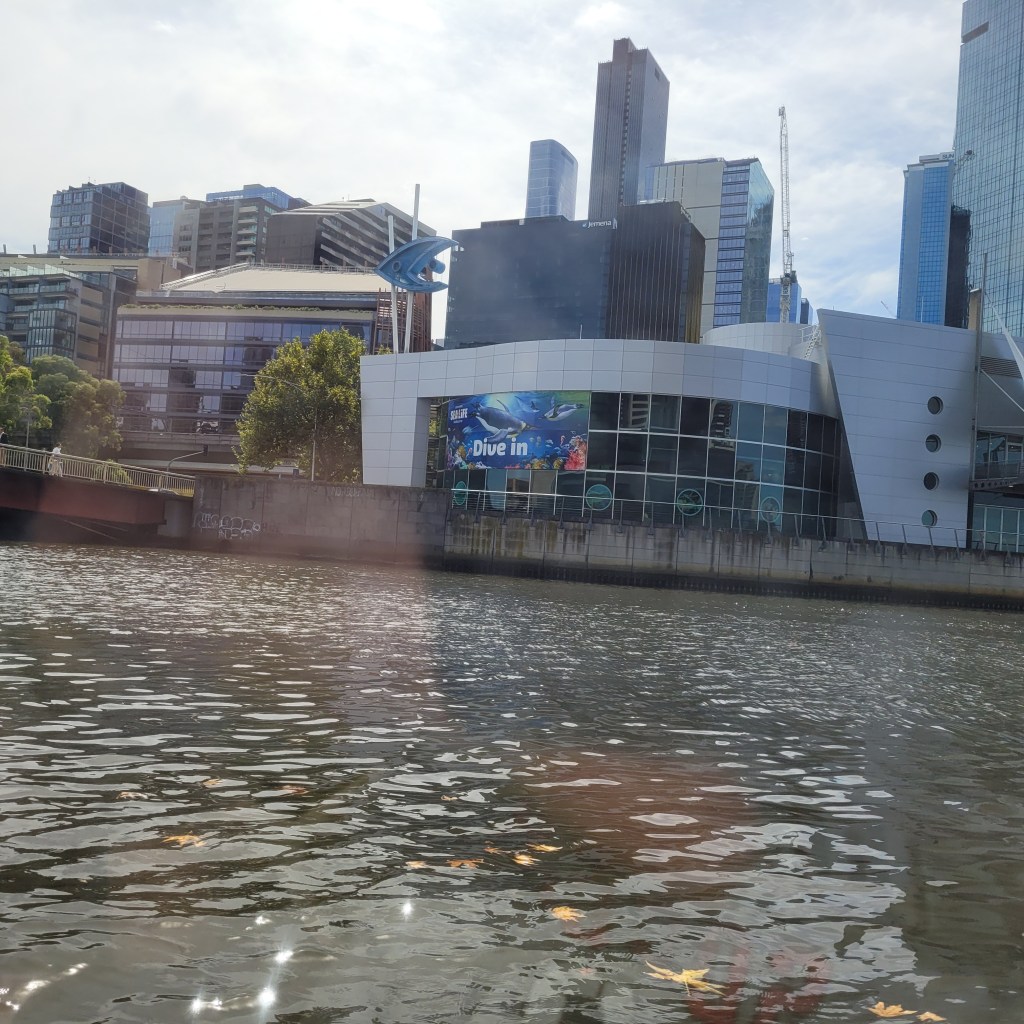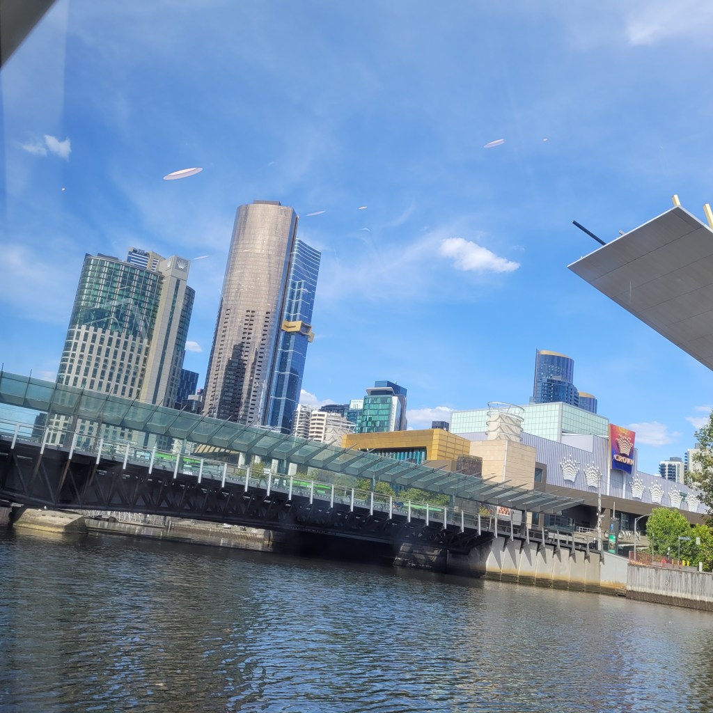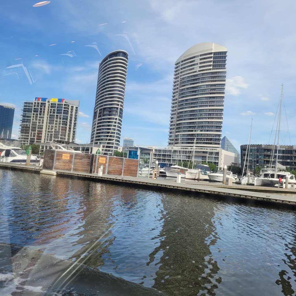 The afternoon was hot, and we both were feeling the heat, so we settled upon a final visit across the Yerra River to Southbank to see if we could find one of the short river cruises that ran most days and get one last chance to enjoy the incredible skyline of this part of urban Melbourne but also see a bit of where its future might be and where its industrial heavy lifting went on. We found a good cruise that carried us with a pleasant group of folks on a one-hour tour that showed us plenty of eye-popping architecture. It gave us an appreciation of the challenges of building on soil that must be heavily reinforced, and I was reminded of the courage and gambler’s fortitude that builders and real estate developers have to possess. These pictures aren’t the greatest, through the windows of a tour boat, but they give you an idea of what we saw.