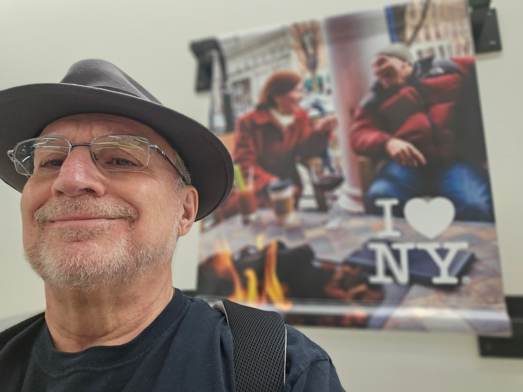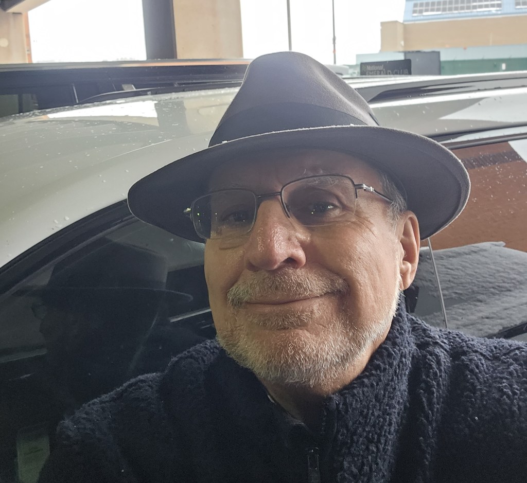 One never travels North in December without suitable outerwear, but the shock was real, as I left the passenger terminal to pick up my rental car. Below is a picture of me, suitably bundled up and wearing my new Kansas City hat as I stand in front of my rental in the airport garage, thinking how pleasant it will be to have Sirius Radio to keep me company through the mountains, as I drive West to Oneonta.