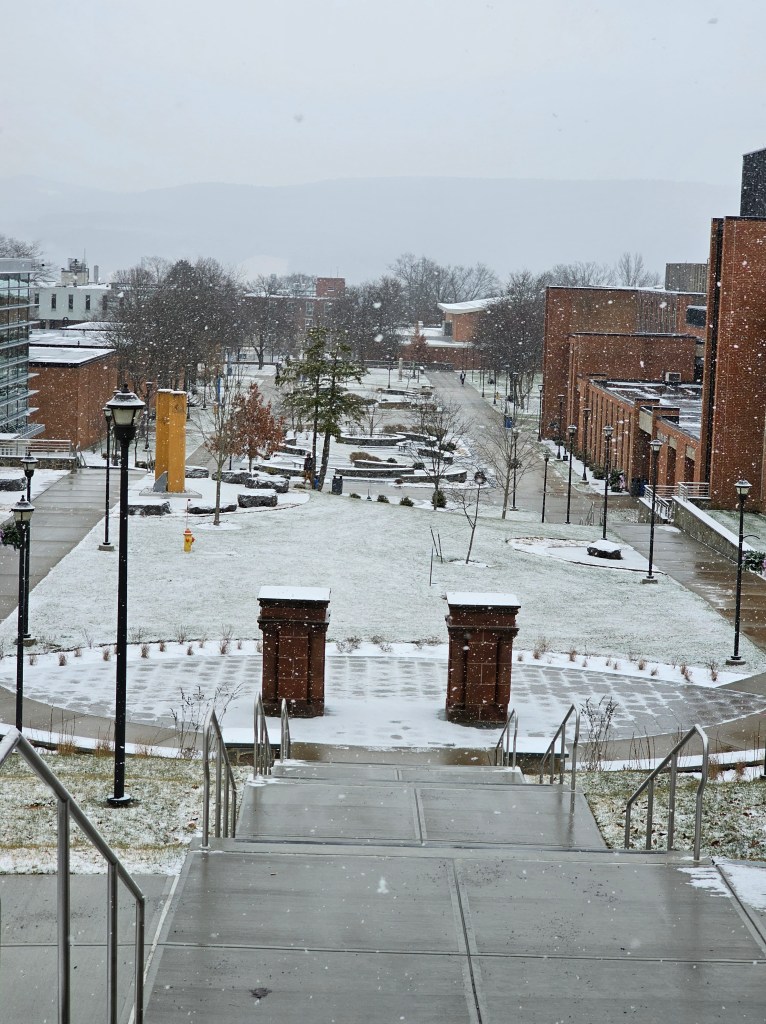 SUNY Oneonta has acronyms. For the best part of half a century, we referred to the institution as “SUCO,” the acronym for the State University of New York College of Arts and Sciences at Oneonta (later shortened to the State University of New York College at Oneonta). We pronounced the long U and O while SUNY College at Oswego which was also SUCO used the short U and the long O. All went along fine until a lttle over a year ago when SUCO was granted University status within the SUNY system. So now it is SUNY-O until we can think of something better. As for the weather, the snow continued to flurry and to use the term my friend Duke coined, it was a slate grey Oneonta day.